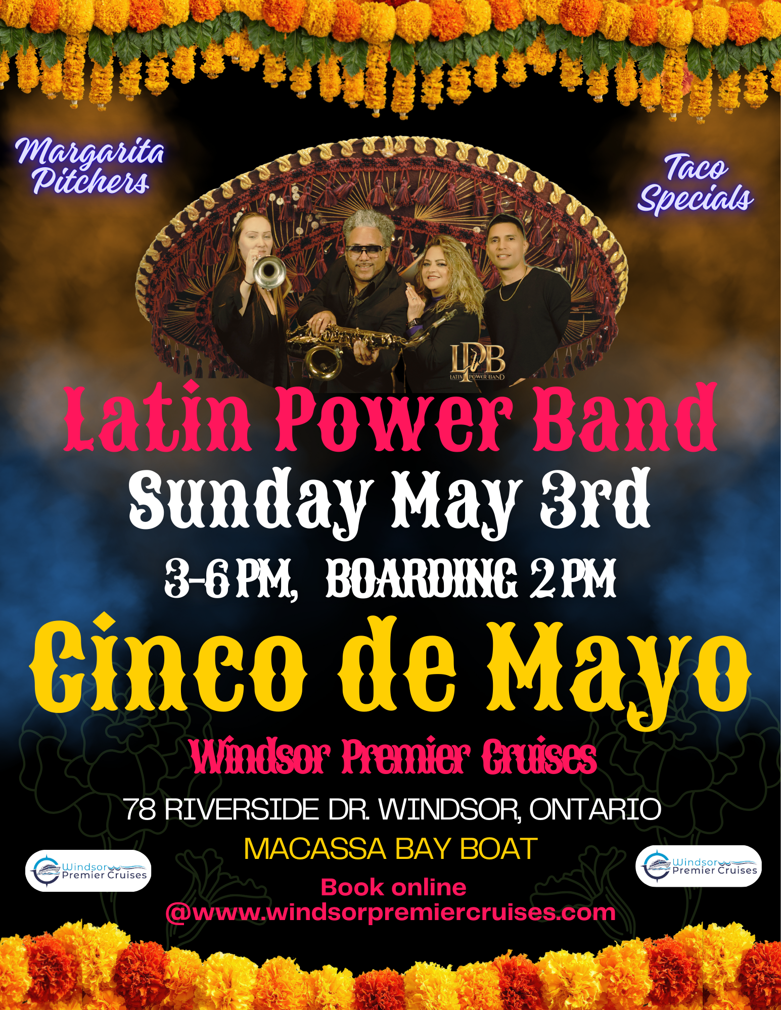 All aboard The Macassa Bay for our 1st Special Event Cruise of the season! We are starting off Fiesta Style with our annual Cinco de Mayo Cruise with “Latin Power Band!” Come celebrate with WPC and join the vibrant dance party.